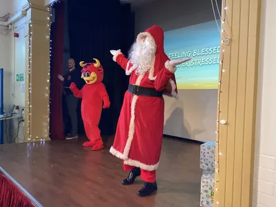 Ho, ho, ho! Santa and Benny the Bull had a great time at St. Benedict's Primary today. We had a dancing and singing competition and then some presents to take home.